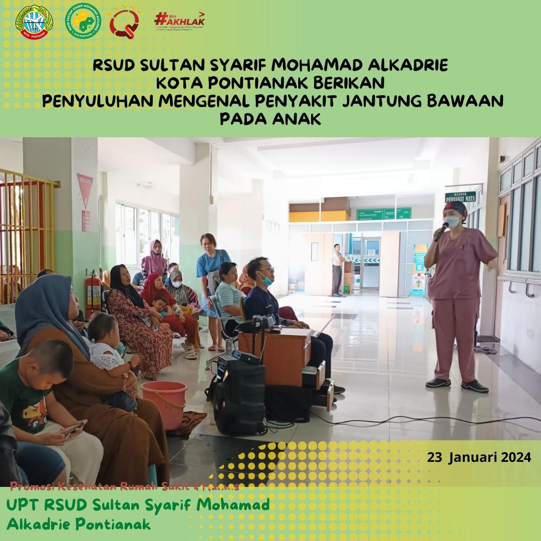 "masyarakat perlu mengenali faktor risiko, gejalanya, dan waktu yang tepat untuk berobat ke dokter," ujarnya ketika memberikan penyuluhan tentang Mengenal Lebih Dekat Penyakit Jantung Bawaan Pada Bayi di Rumah Sakit Umum Daerah (RSUD) Sultan Syarif Mohamad Alkadrie (SSMA) Kota Pontianak, Selasa (23/01/2024).
